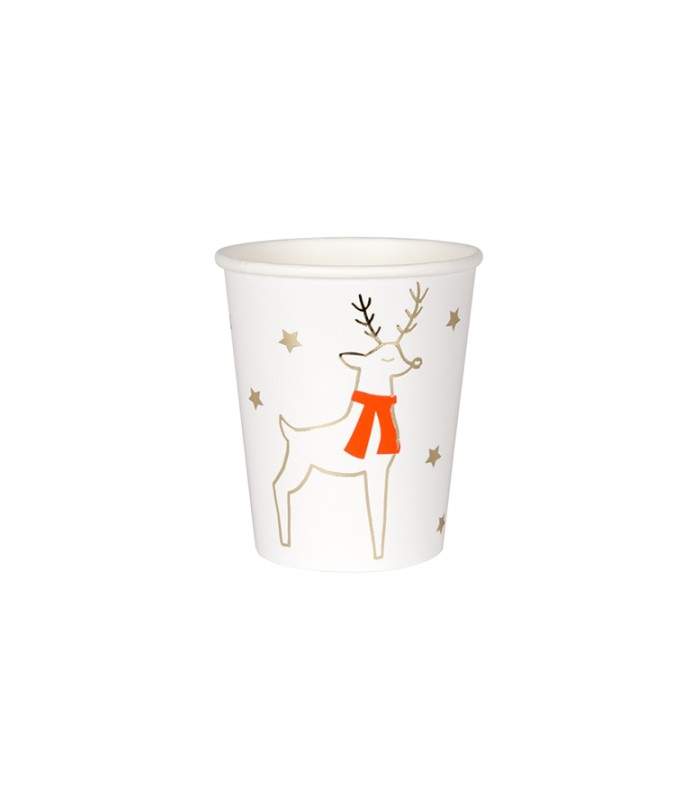 Favorite for these pretty cardboard cups with Christmas patterns mixing reindeer and small stars in gold print !