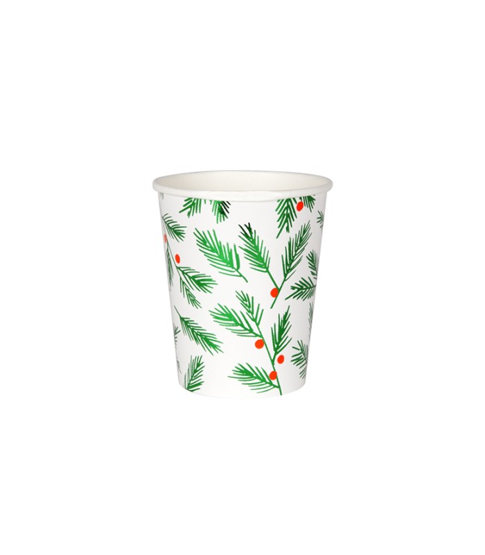 8 white paperboard cups decorated with festive leaves and berries, designed by Meri Meri. These cups are perfect for a Christmas or New Year's table !