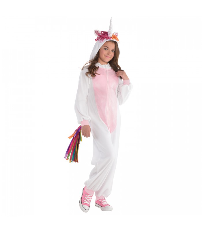 The pink and white Zipster Unicorn One Piece Costume is the stuff dreams are made of! The one-piece unicorn jumpsuit costume is made of comfortable fleece and has stretch wrist and ankle cuffs. It features a light pink stomach and a prismatic rainbow tail and matching mane. The tail secures with a hook-and-loop closure and can be removed. No unicorn outfit is complete without a horn — a prismatic silver unicorn horn and ears are attached to the hood. A front zipper makes it easy to get in and out.