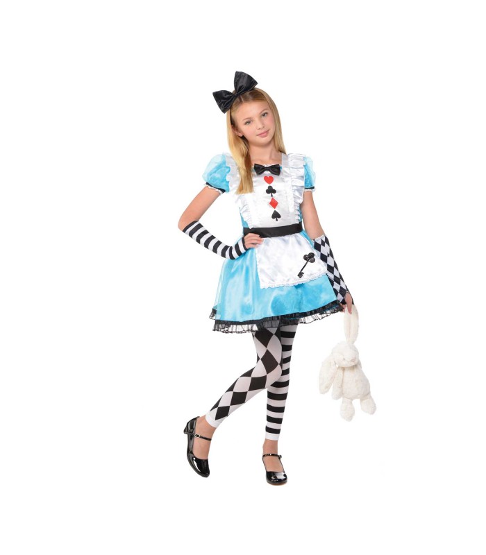 This beautiful disguise of Alice in Wonderland includes a sky blue dress with puff sleeves, the top with frills and the bottom of an apron. Black and white legging, matching cuffs and a black bow tie headband complete this refined costume.