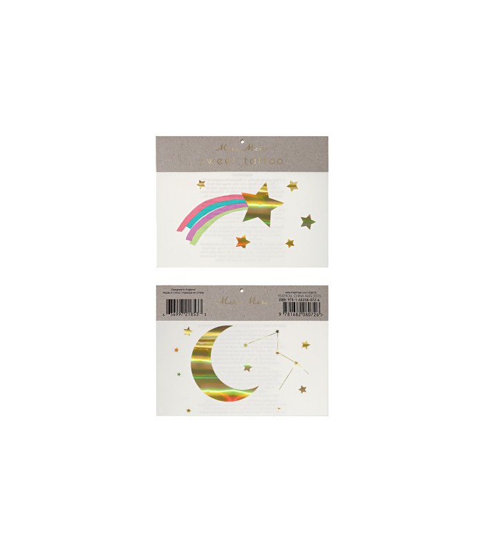 2 temporary tattos from Meri Meri. Cool and design for small and big kids alike! Sticks easily in 30 seconds, lasts a long time and comes off with soap!