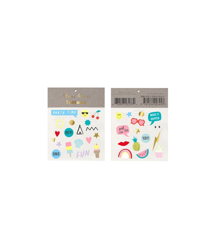 2 temporary tattos from Meri Meri. Cool and design for small and big kids alike! Sticks easily in 30 seconds, lasts a long time and comes off with soap!