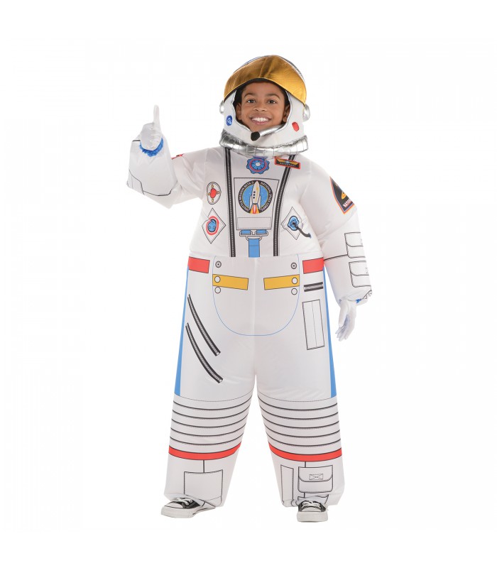 Take their Halloween costume to new heights with an Inflatable Astronaut Costume for kids! This astronaut costume features an inflatable jumpsuit printed with astronaut suit details and a zipper closure with an attached battery pack for the fan. The astronaut helmet is made of soft material with gold and silver metallic trim and a fabric microphone to give it a realistic look. A face opening in the helmet makes it easy to breathe while your little explorer is traveling through space or house-to-house while trick-or-treating on Halloween night.