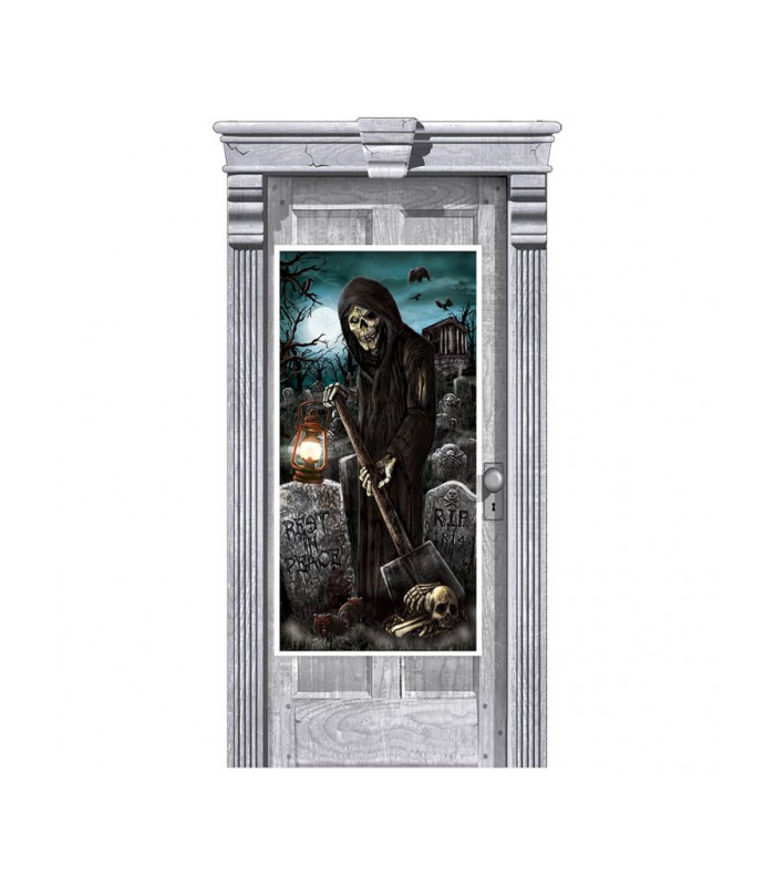This Halloween Door cover features a grave digging skeleton, creeping between the tombstones of a haunted cemetery. The reusable plastic sheet is easy to mount to most flat surfaces and will instantly transform any room into a ghostly graveyard.