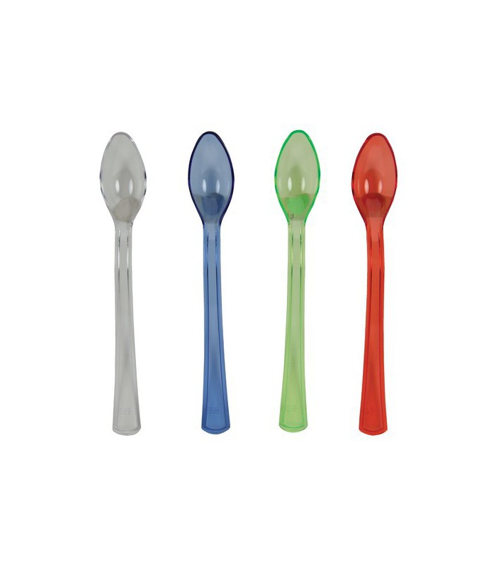 Ces 20 mini cuillères assorties en plastique sont une façon amusante et à la mode pour mettre en évidence vos tables de fête. Chaque paquet contient 24 cuillères transparentes, de couleur rouge, bleu, vert et clair.