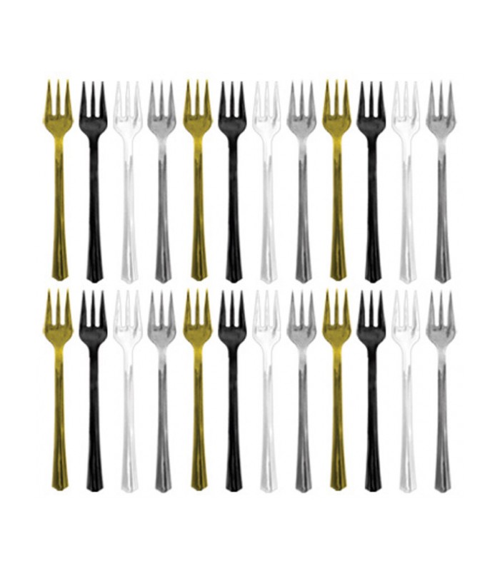 Ces mini fourchettes métallisées sont idéales pour les tables de fêtes, élégantes et durables. Chaque paquet contient 24 fourchettes dans un assortiment de noir, doré, argenté et blanc.