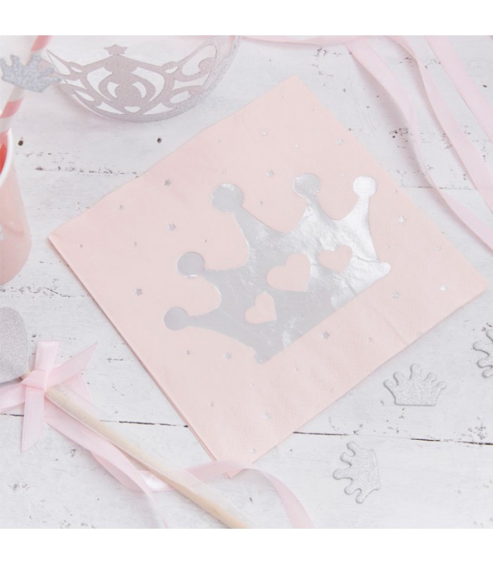Ces jolies serviettes roses ornées d'une magnifique tiare en métallisée argentée. Ces serviettes habilleront avec chic et élégance votre fête d'anniversaire et ravira les princesses conviées.