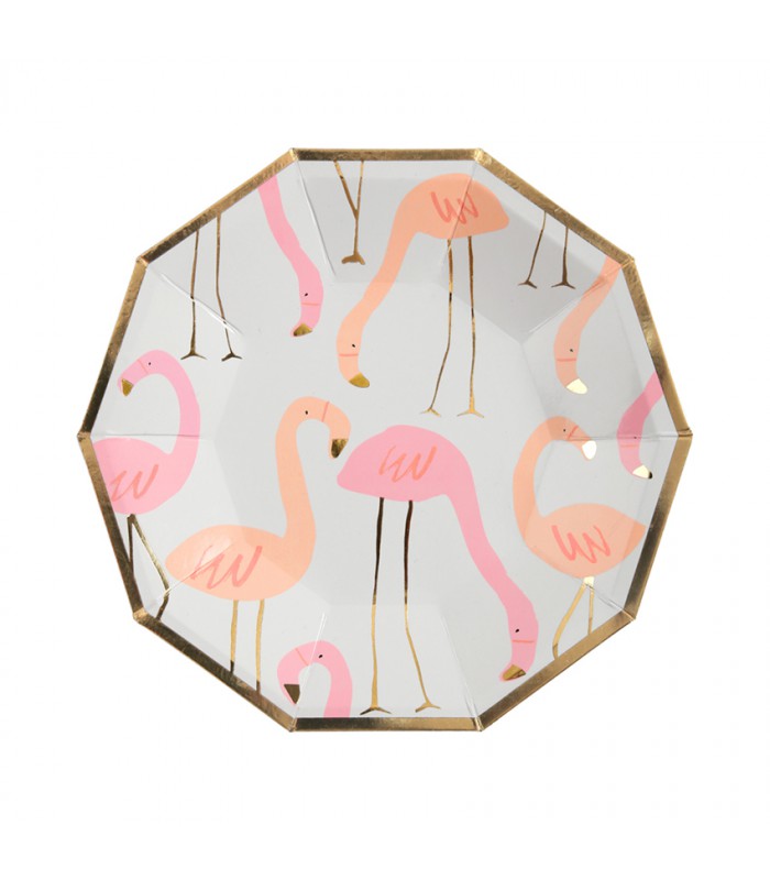 Un volier de flamants roses exotiques est le motif de ces superbes assiettes ! Par ailleurs, elles sont ornées d'un papier métallisé doré.
