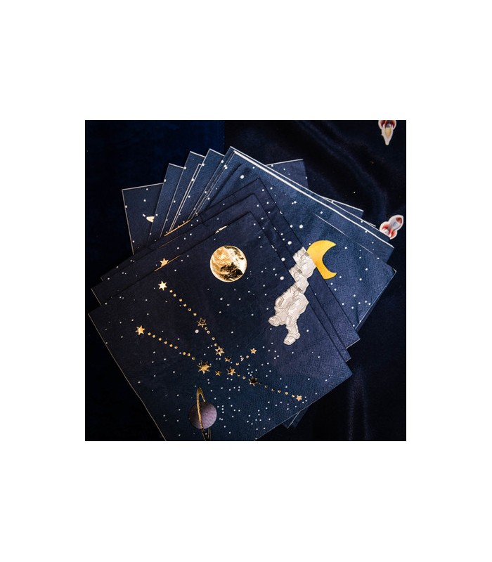 Astronaute, prêt pour votre mission anniversaire? Décollage immédiat pour l'espace, partez à la conquête de la lune et de ses planètes avec ces sublimes serviettes astronautes marine avec détails dorés.