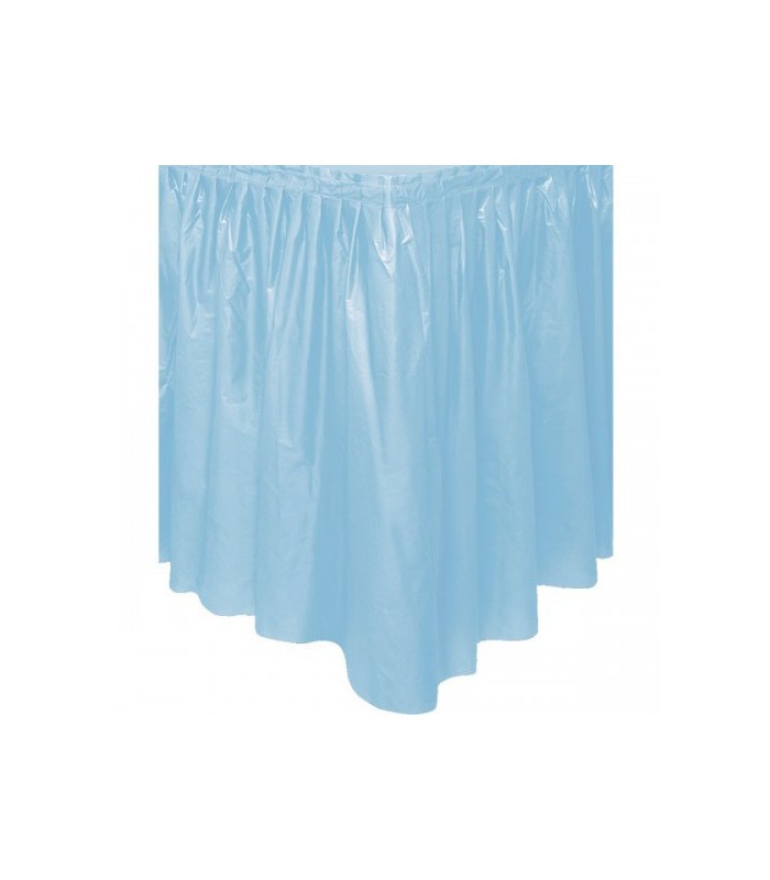 Jupe de table en platique de couleur bleu ciel avec bande adhésive à l'endos. Dimension: 73cm x 426cm