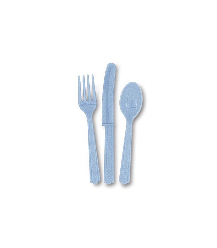 Chaque paquet comprend 18 pièces de couverts en plastique de couleur bleu ciel, soit 6 cuillères, 6 fourchettes et 6 couteaux. Lavable et réutilisable