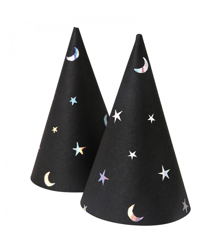 Ajoutez une touche festive à votre fête avec ces Mini chapeaux! Ils sont ornés d'étoiles et de lunes en papier brillant argenté et se fixent à l'aide d'un élastique. Paquet de 8 chapeaux.