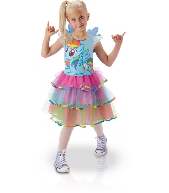 Une robe tutu aux couleurs arc-en-ciel avec sur le haut l'effigie de Mon Petit Poney. Pour une journée et une fête haute en couleurs !