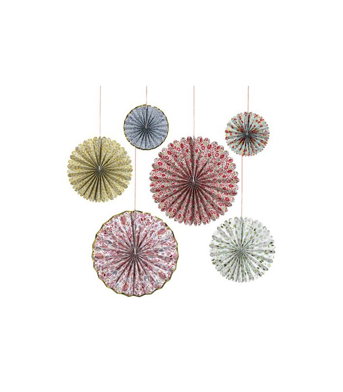 6 rosaces en papier alévéolé motif Liberty. Ces jolies rosaces apporteront une touche déco originale à vos fêtes. Idéale pour un fond de photobooth, décorer les murs de votre fête ou de l'arrière-plan de vos buffets!