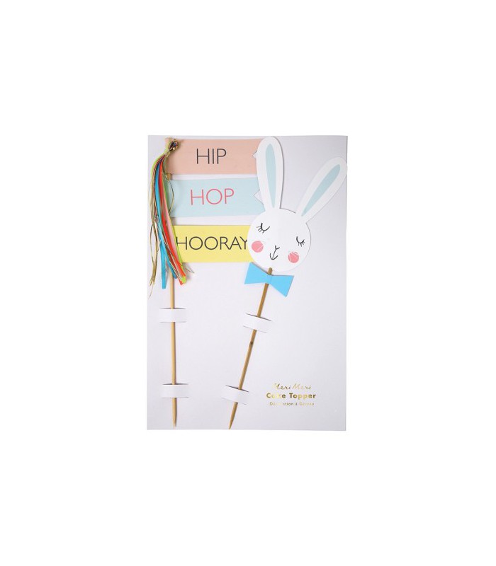 HIp Hop Hooray! Ces jolis cake toppers ajouteront une touche tendance et originale à votre gâteau. Un lapin des plus branché avec noeud papillon et un topper Hip Hop Hooray avec tassels et twine dorés. Un super effet, pour une super fête!