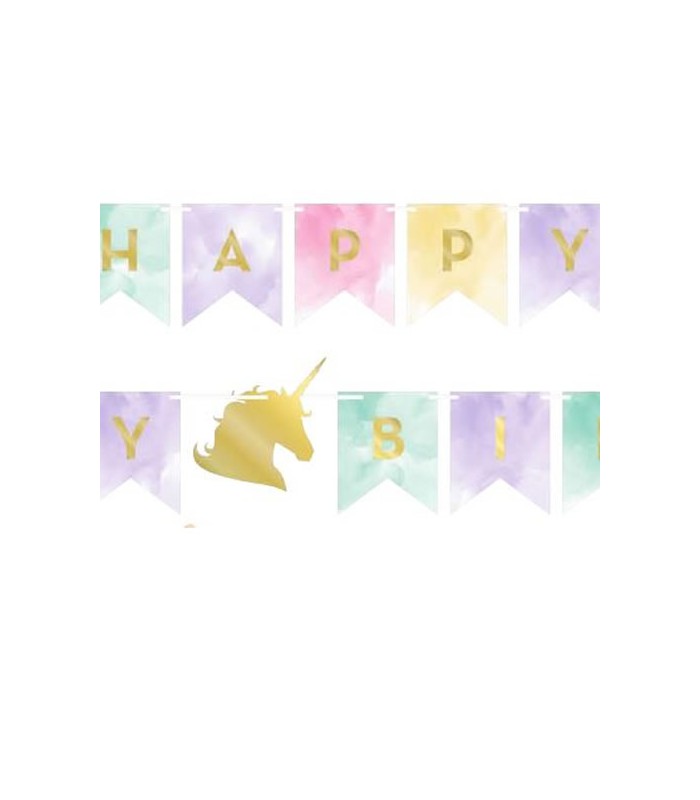 Guirlande "Happy Birthday" de notre thème Unicorn Sparkle. Parfaite pour décorer vos murs ou pour accrocher à l'entrée de votre salle pour accueillir vos petits invités!