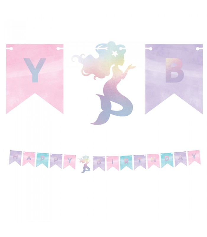 Guirlande Sirène Scintillante avec le message « Happy Birthday ». Parfaite pour décorer vos murs ou pour accrocher à l'entrée de votre salle de fête afin d’accueillir vos sirènes dans un décor sous-marin !