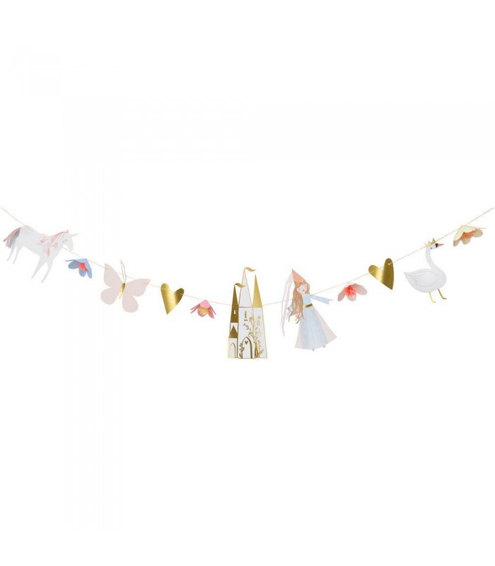 Transformez la salle de fête en un royaume magique avec cette magnifique guirlande. Elle comprend des fanions joliment illustrés et embellis, y compris une jolie princesse avec des rubans dans les cheveux.