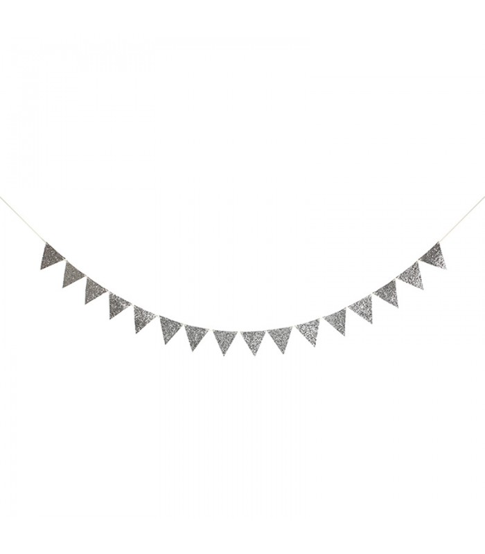 Parfait pour la décoration d'une scène festive ! Cette guirlande stylée a des fanions en triangle agrémentés de grosses paillettes argentées et sera suspendue par un ruban de coton finition naturelle.