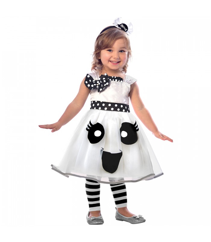 Notre délicieux costume de Fantôme Mignon inclut une jolie robe en tulle blanc avec les yeux et la bouche d’un fantôme gracieux sur le devant. La partie supérieure de la robe est faite d'un matériau semblable à de la soie blanche avec un motif à pois, et elle est ornée d'un gros nœud noir, également avec un motif à pois, attaché vers l'épaule de la robe. La robe est terminée avec un décolleté en froufrou et une ceinture-ruban attachée, le tout avec un motif à pois. Un bandeau noir avec un nœud blanc et une bulle "boo" attachés finalisera ce joli déguisement.