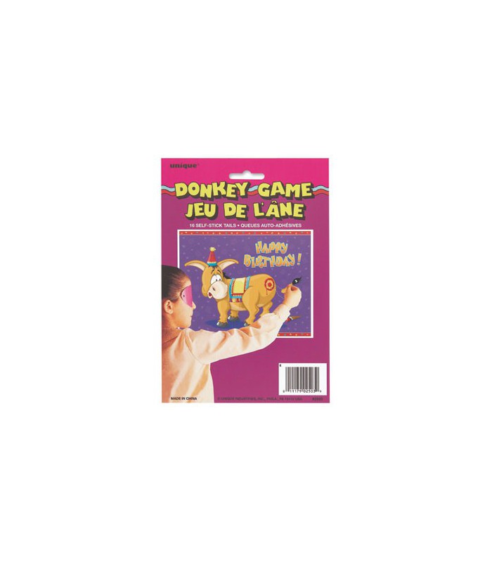 Jeu de l'âne à fixer au mur. Le joueur qui colle la queue de l'âne le plus près de l'emplacement indiqué gagne! Fous-rires garantis, surtout si vous tournez les enfants quelques tours sur eux-mêmes! Assurez-vous d'avoir à disposition plusiers petits cadeaux à distribuer aux joueurs.