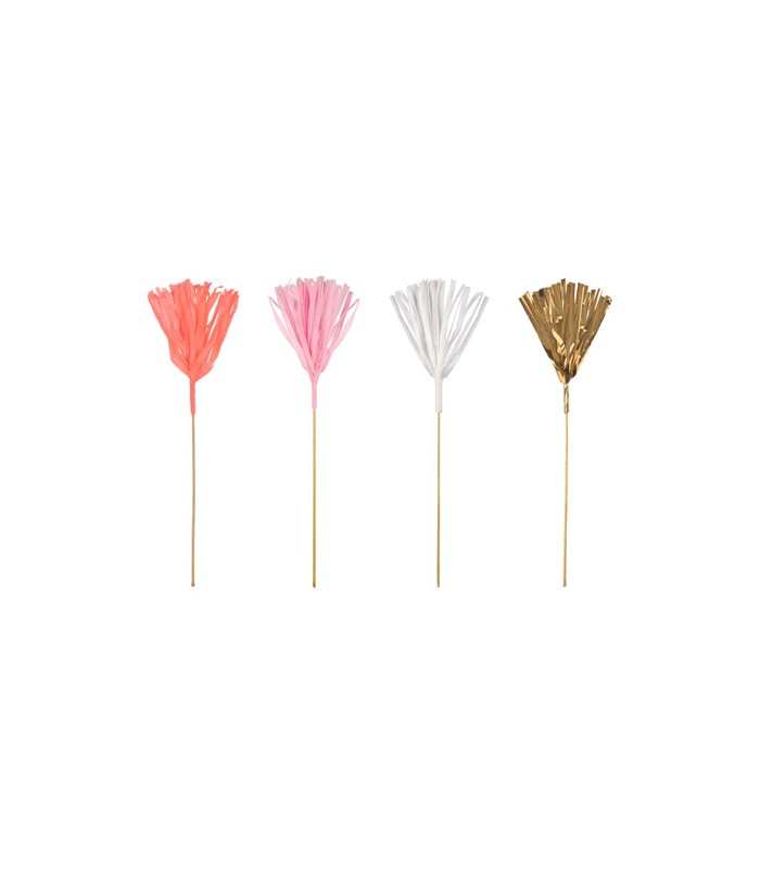Utilisez ces jolis piques tassels pour décorer vos gâteaux et boissons afin d'apporter des couleurs à votre table de fête ! Les tassels sont en papier de soie coloré et en film mylar brillant.