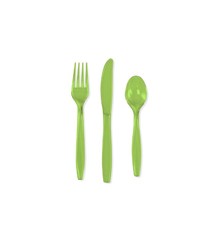 Chaque paquet comprend 18 pièces de couverts en plastique de couleur lime, soit 6 cuillères, 6 fourchettes et 6 couteaux. Lavable et réutilisable