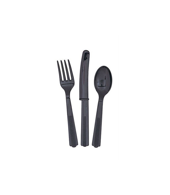 Chaque paquet comprend 18 pièces de couverts en plastique de couleur noir, soit 6 cuillères, 6 fourchettes et 6 couteaux. Lavable et réutilisable
