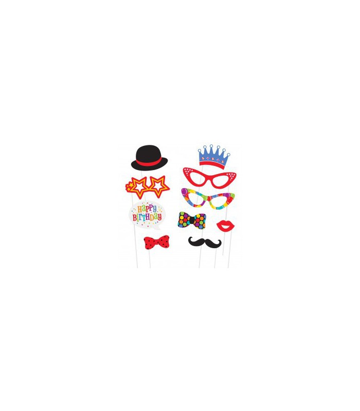 Kit de 10 photo booth avec 10 accessoires différents sur baguettes. Rigolos et sympas pour prendre la pose et pour une ambiance garantie lors de votre fête! Capturez votre grand jour avec des clichés uniques et délirants de vos amis et invités avec ce kit. Fous rires assurés! Le paquet contient 10 accessoires différents. 22cm