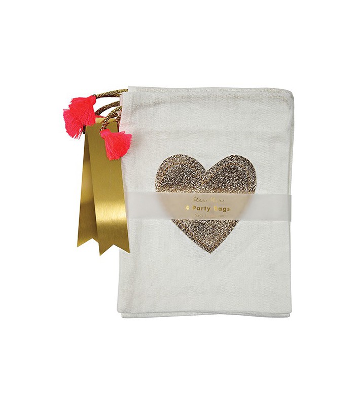 Un gros coeur pailleté doré orne ces jolies pochettes en lin. Chaque sac est pourvu d'une étiquette dorée et d'un tassel doré. Il sera un vrai coup de coeur! Meri Meri