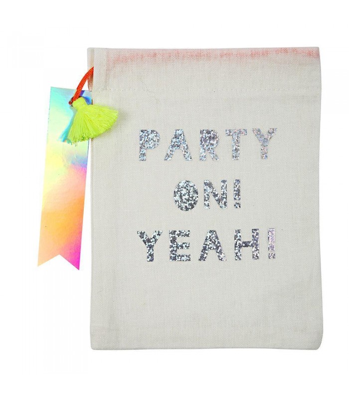Semez de la joie et des paillettes avec ces jolies pochettes en lin avec l'inscription Party On! Yeah! Chaque sac est pourvu d'une étiquette colorée et d'un tassel jaune vif. Il sera un vrai coup de coeur! Let's get this party started!