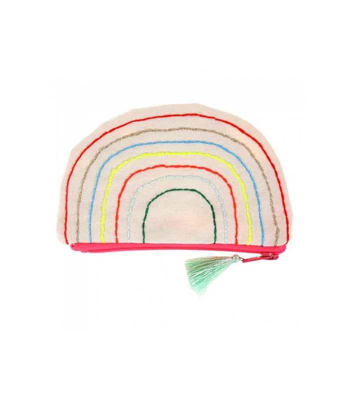 Une jolie pochette en toile de coton en forme d'arc-en-ciel. Ses coutures fluos accessoirisé d'un pompon pour la ferméture éclair rose donnera à cette petite trousse une note tendance et girly! Meri Meri