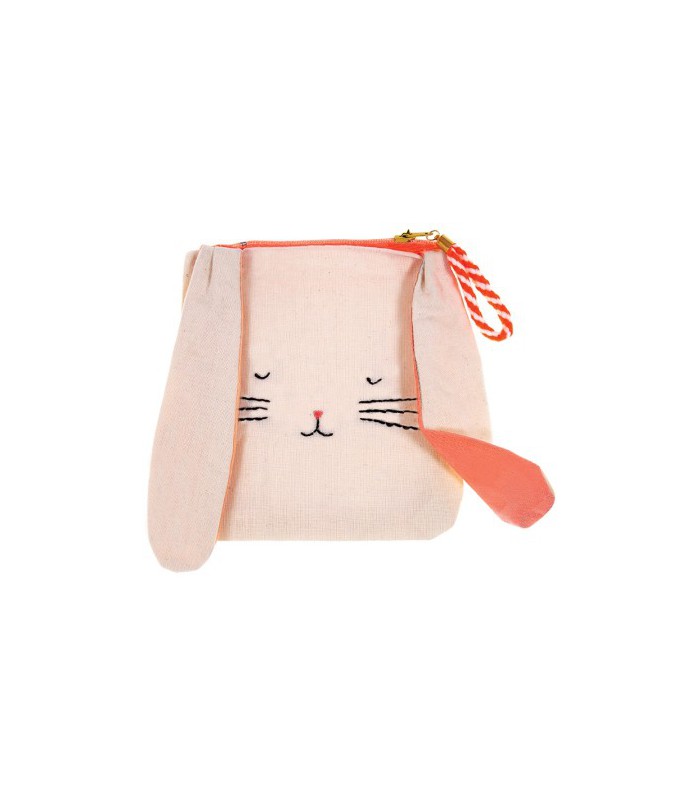 Jolie pochette en coton en forme de lapin aux grandes oreilles qui plaira aussi bien aux enfants qu'aux adulte! Un adorable accessoire à mettre dans son sac ou cartable pour y ranger vos petits trésors, crayons, à utiliser comme porte-monnaie ou ce qui vous fait plaisir! Pochette en coton brodé avec fermeture éclair corail fluo.