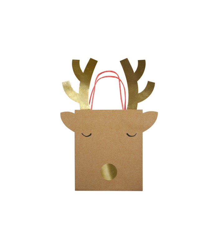 Ce joli sac cadeaux en papier, imaginé par Meri Meri, est réalisé dans le style d’une tête de renne avec ses bois et son nez pompon dorés, pour emporter et sublimer vos cadeaux! Les poignées sont en cordon rouge.