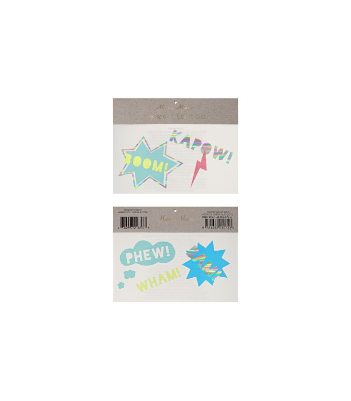 6 tatouages temporaires de la marque Meri Meri cools et design pour petits et grands! Se collent facilement en 30 secondes, durent longtemps et s'enlèvent avec du savon!