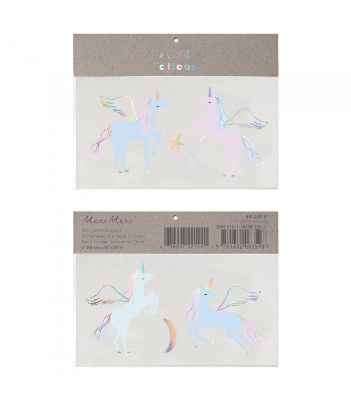 Tatouages temporaires de la marque Meri Meri cools et design pour petits et grands! Se collent facilement en 30 secondes, durent longtemps et s'enlèvent avec du savon!