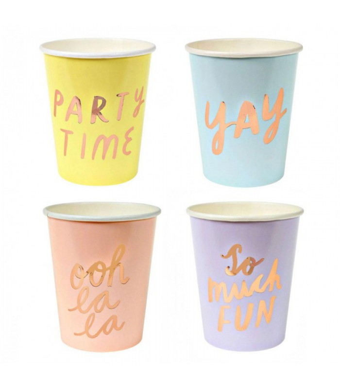 8 jolis gobelets de couleur pastel avec des typos fun en or rose cuivré qui mettra tous vos invités dans une ambiance festive! De quoi créer une fête styléel, tendance, décalée et s'exclamer "Ooh la la"!