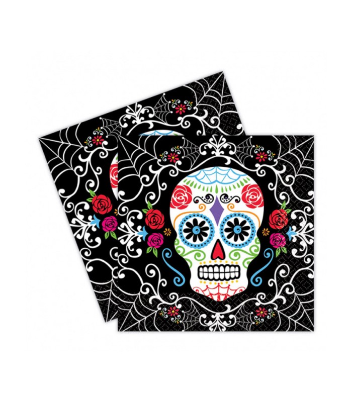 Serviettes fleuries avec une tête de mort sur fond noir.