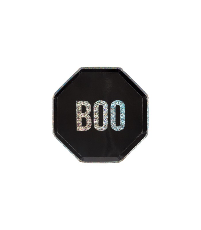 On adore ces assiettes imprimées "BOO" avec détails en papier argenté, idéales pour compléter la déco de table d'une soirée d'Halloween, mais aussi pour un anniversaire sur le thème Glitter ou Noir ! N'hésitez pas à les associer aux serviettes "BOO" assorties, pour un effet