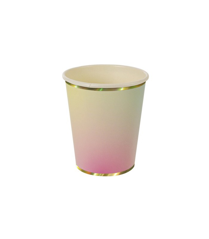 Chaque paquet comprend 8 gobelets ombré. Le joli dégradé de couleur pastel est hyper tendance et le bord doré apportera une touche élégante à votre fête.