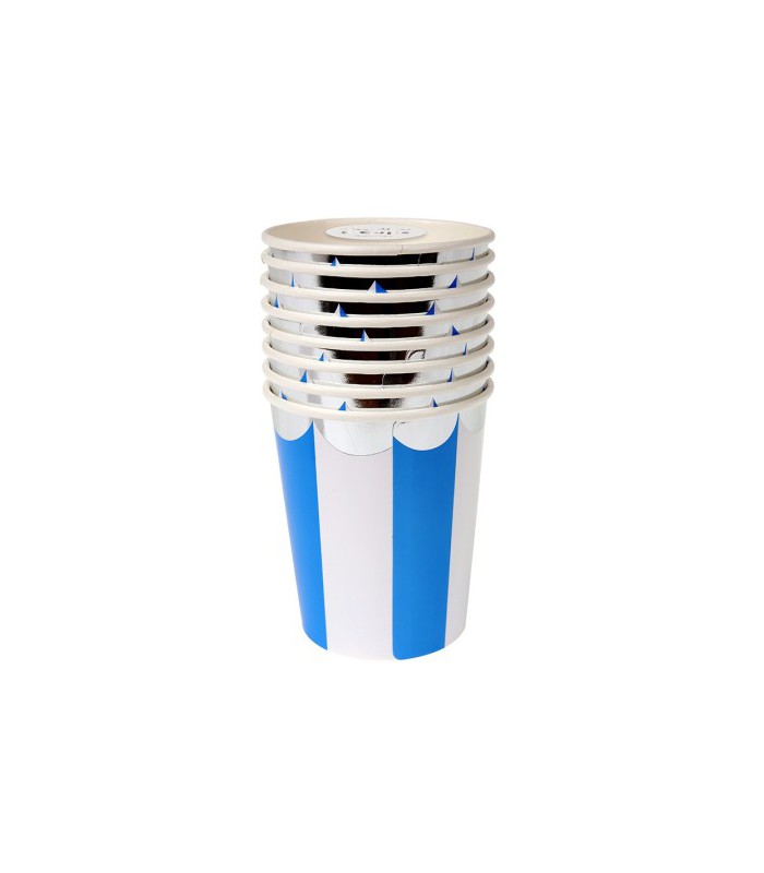 Chaque paquet comprend 8 gobelets en carton à rayures de couleur bleue avec une jolie bordure argentée. Ces gobelets habilleront vos tables avec leur joli contraste entre le motif géométrique des rayures et la bordure dentelée argentée.