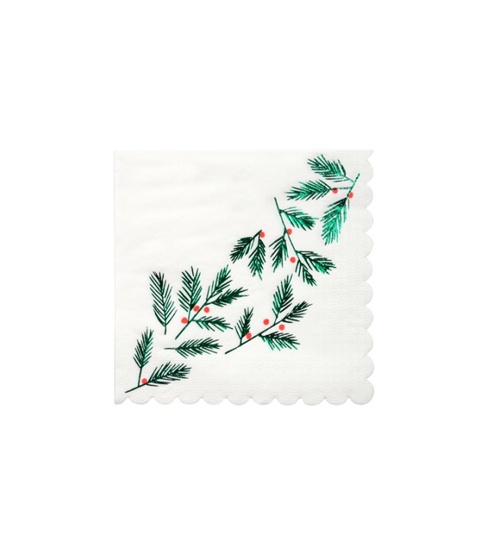 8 grandes serviettes en papier blanc dessinées par Meri Meri et décorées de feuilles et de baies festives. Ces serviettes sont idéales pour un réveillon de Noël ou d'un Nouvel an !